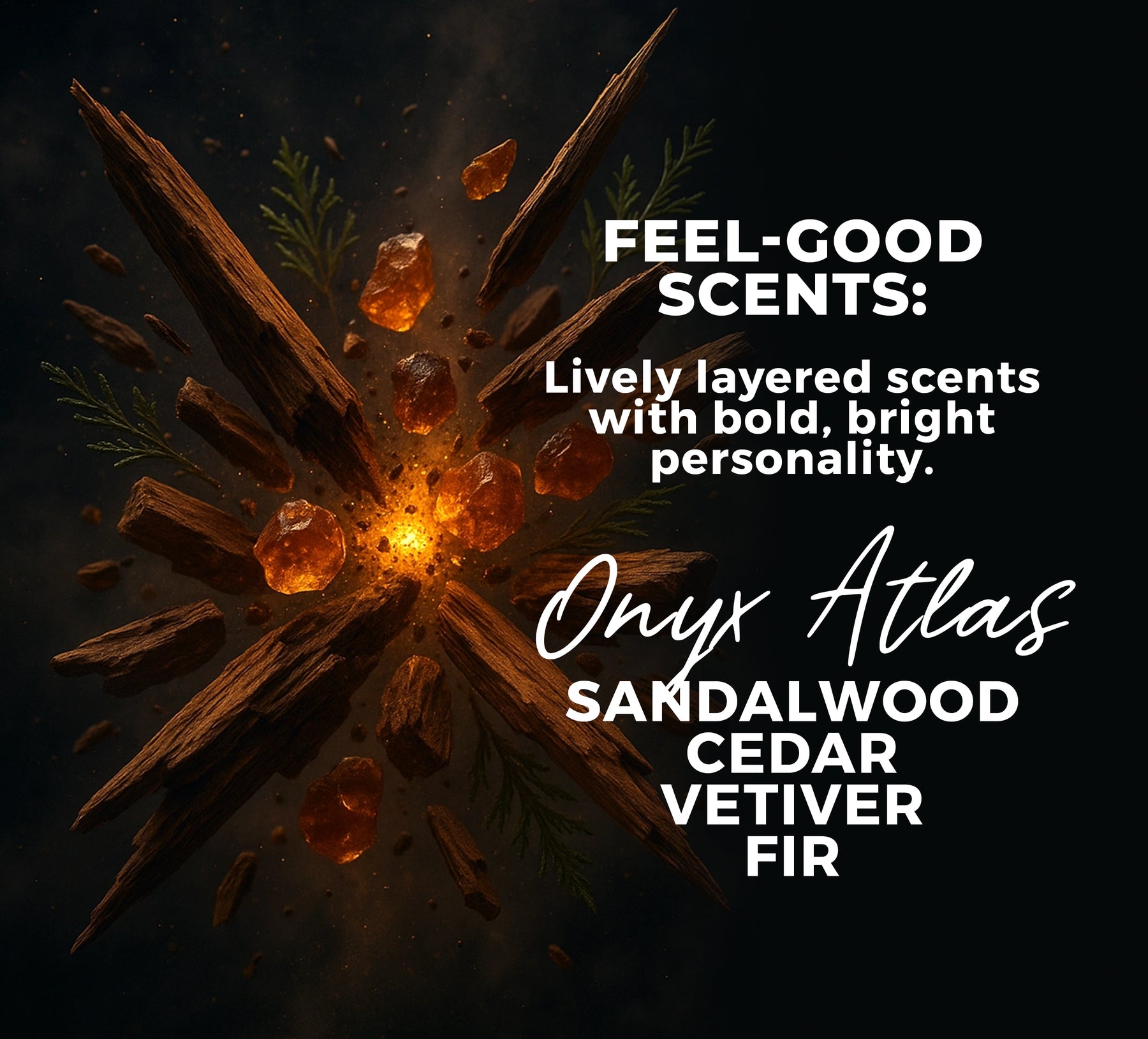 Wooden block with sandalwood, cedar, vetiver, and fir notes text on a dark background